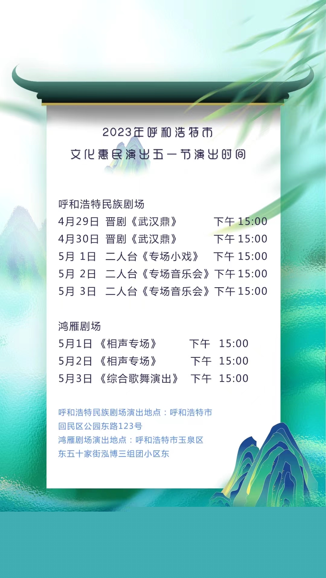 ? ? 從4月29日至5月3日,在呼和浩特市民族劇場、鴻雁劇場綜合歌舞演出、相聲專場、二人臺專場音樂會、二人臺專場小戲、晉劇《武漢鼎》等輪番上演,總有一個符合您的心意,攜家人或三兩好友相伴同行,走進演出劇場,近距離感受藝術多姿百態(tài),在古典文化的浸潤和熏陶中,度過一個印象深刻的五一假期。