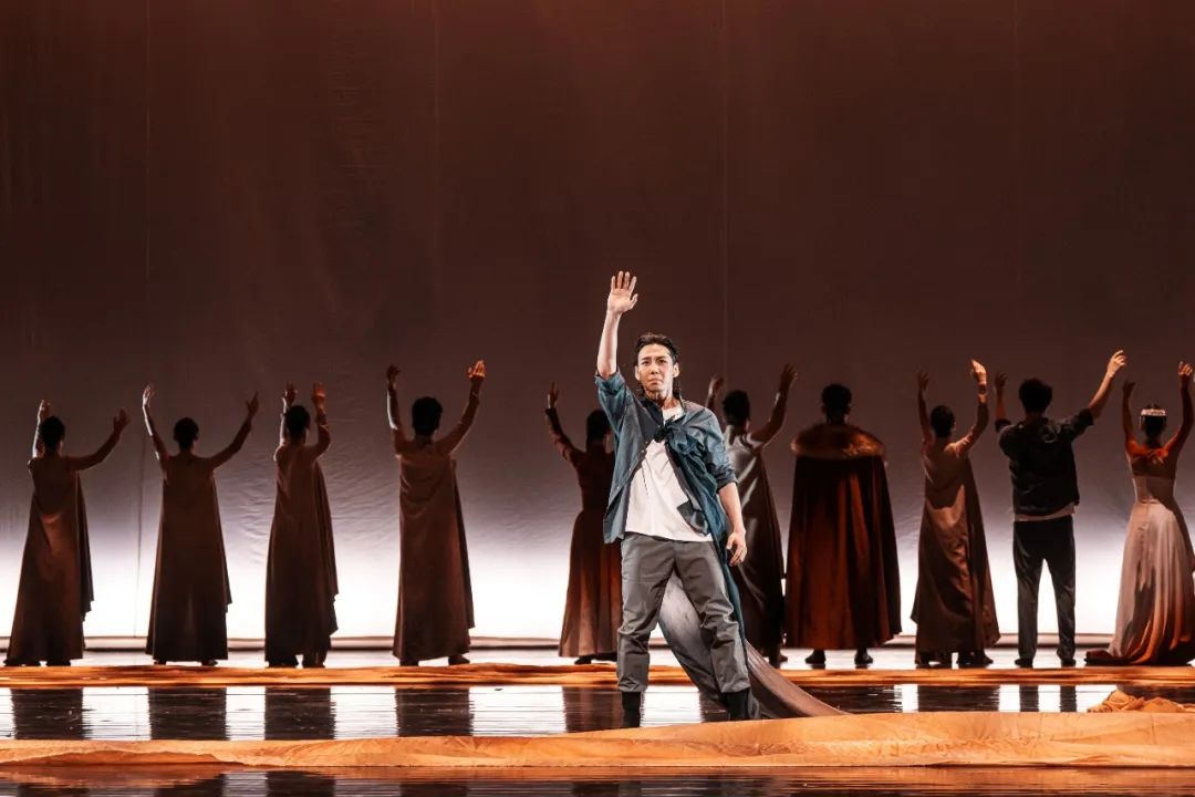 ? ? “敕勒川,陰山下,天似穹廬籠蓋四野……”,《敕勒川》以渾渾浩浩的曲調(diào)勾勒出天空蒼闊,碧綠遼遠(yuǎn)的意境,將詩歌的古韻與舞蹈藝術(shù)相結(jié)合,表現(xiàn)出東方古典美學(xué)的寫意和留白,讓作品在詩意的表達(dá)過程中具有強烈的抒情性,并在此基礎(chǔ)上進(jìn)行大膽創(chuàng)新,通過“千古尋緣”“史中大愛”“力蘊北疆”“川歸黃河”四幕的巧妙構(gòu)思,將一位青年作曲家譜寫交響樂《敕勒歌》的心路歷程與敕勒川這片土地的過往和當(dāng)下巧妙地串聯(lián)起來,從陰山巖畫到史書記載,從無垠草原到黃河滔滔,“作曲家”一次次經(jīng)歷創(chuàng)作的至暗時刻后又一次次在雄渾壯美的自然與歷史中得到療愈,最終在歷史與現(xiàn)實的交響中實現(xiàn)人生追求與信仰的涅槃,生動展現(xiàn)了中華民族在漫長的歷史長河中關(guān)于生命這一永恒主題的思考。劇中除了融入蒙古族、漢族等傳統(tǒng)服飾和音樂等元素,還嘗試結(jié)合現(xiàn)代舞的表現(xiàn)方式,利用光影效果增強舞臺視覺沖擊力。在整個劇情發(fā)展中設(shè)置了幾個關(guān)鍵的情感轉(zhuǎn)折點,如摯愛之人的分別、對家園深深的眷戀之情等,從而引發(fā)觀眾的情感共鳴。
